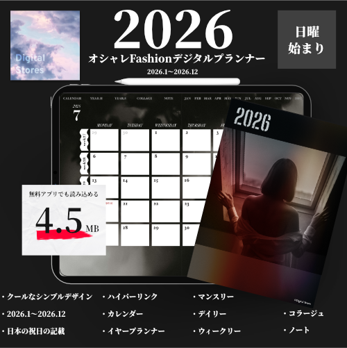 【2025年12月始まり】2026年デジタルプランナー|クールでおしゃれ|Fashionsnapやコラージュ好きな人におすすめ|無料版にも読み込める4.5MB【日曜始まり】 | digitalstores