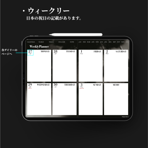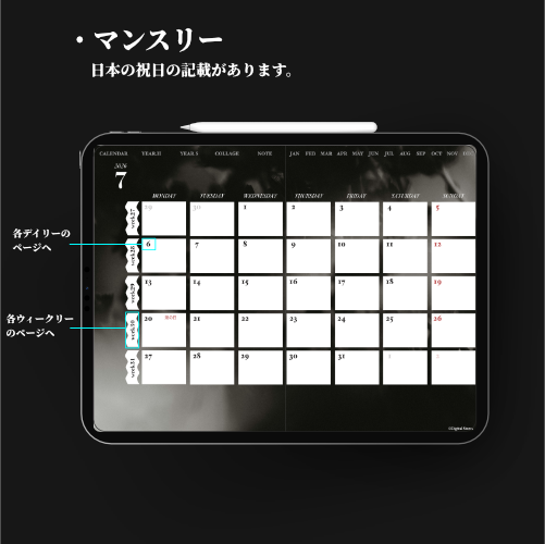iPadのGoodnotesなどでご使用いただける2026年デジタルプランナーです。無料版だとpdfデータサイズの5MBの読み込み制限のあるアプリでも読み込めます。画像を貼り付けしやすいようなページ構成。2026年1月から2026年12月まで(PDFデータです。)各ページに飛べるようにリンクを設定してあります。日本の祝日の記載ありです。
