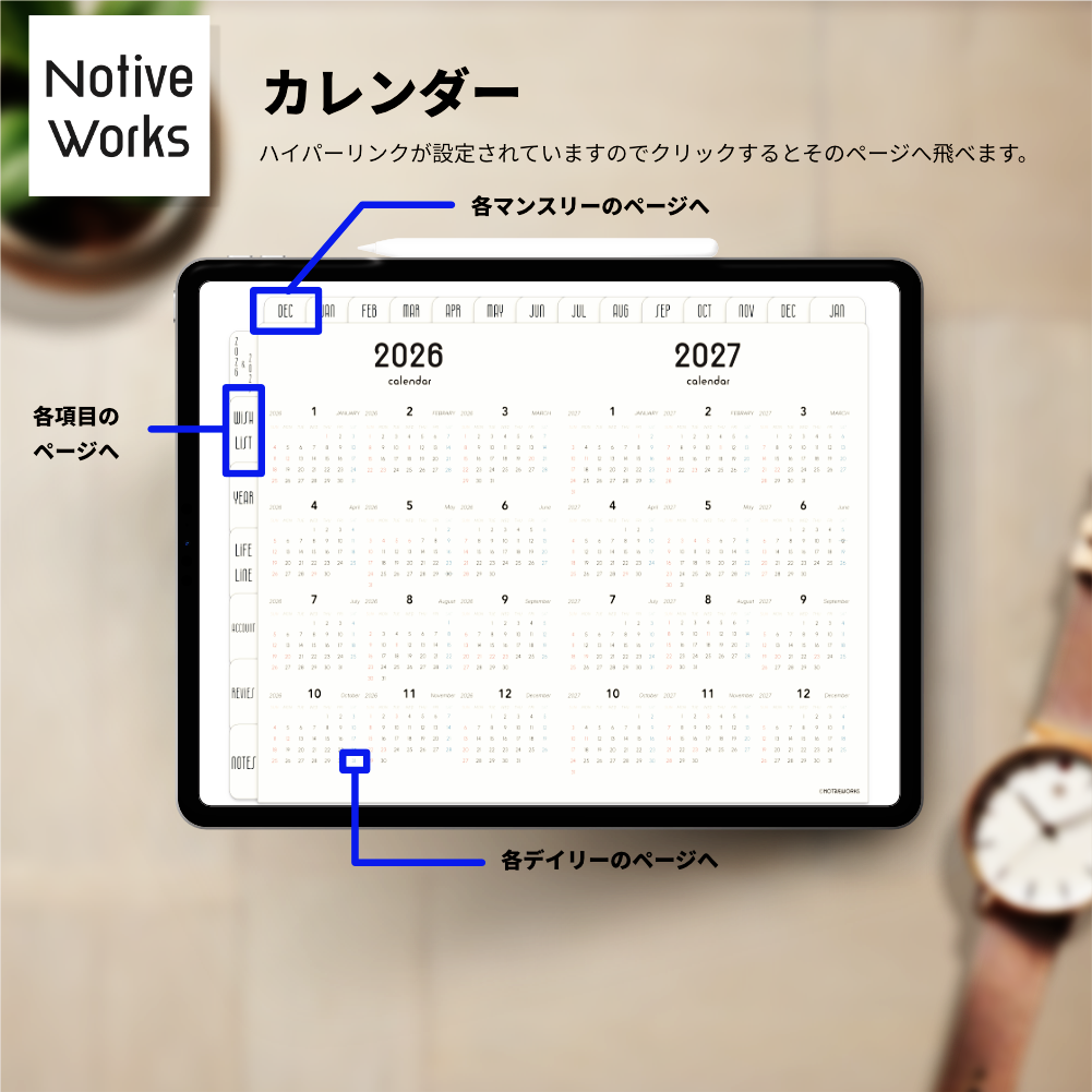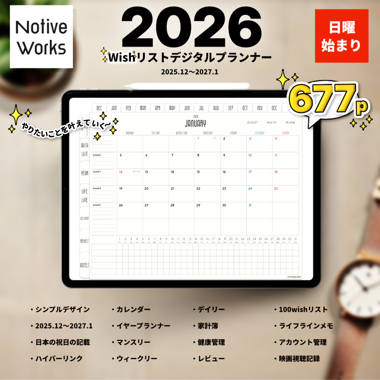 本プランナーは、2025年12月〜2027年1月(14カ月)をカバーするデジタル手帳。やりたいことリストを“計画ページ”とマンスリー/ウィークリー/デイリーへつなぐ内部リンク設計で、願いを“今日の一手”まで一直線にブレイクダウンできます。