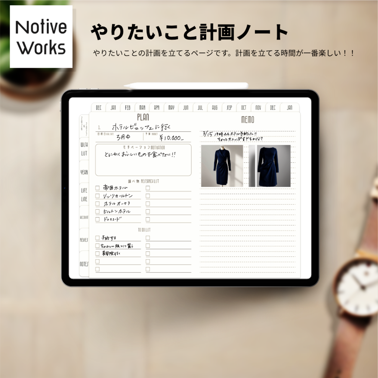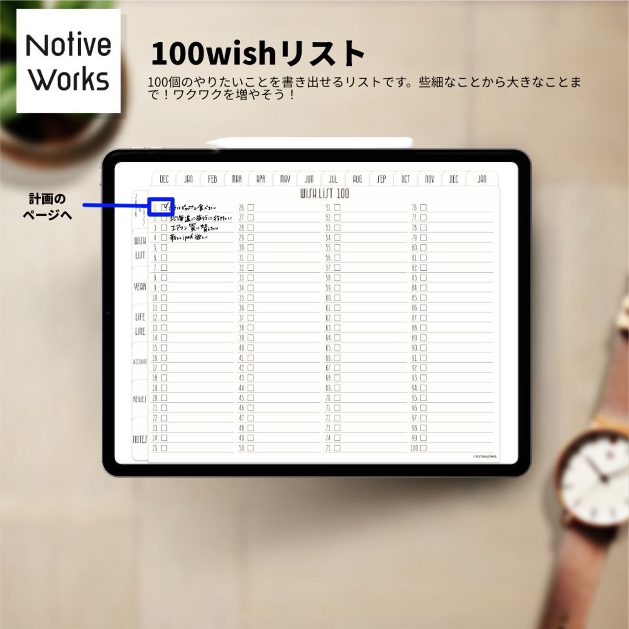 • やりたいこと100リスト+各項目の計画ページ(期限・進捗・次の一手を書きやすい設計)