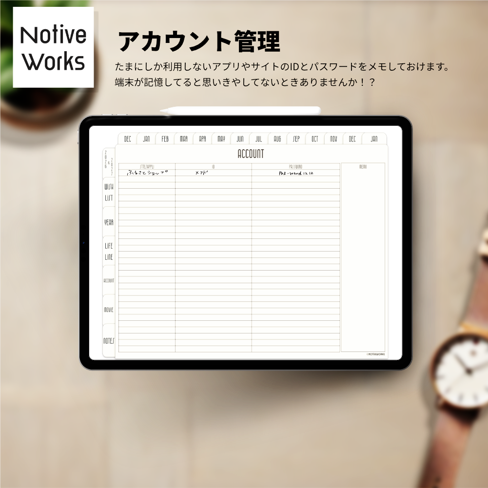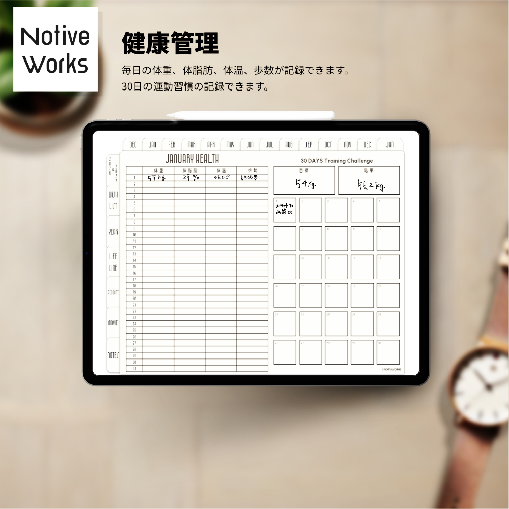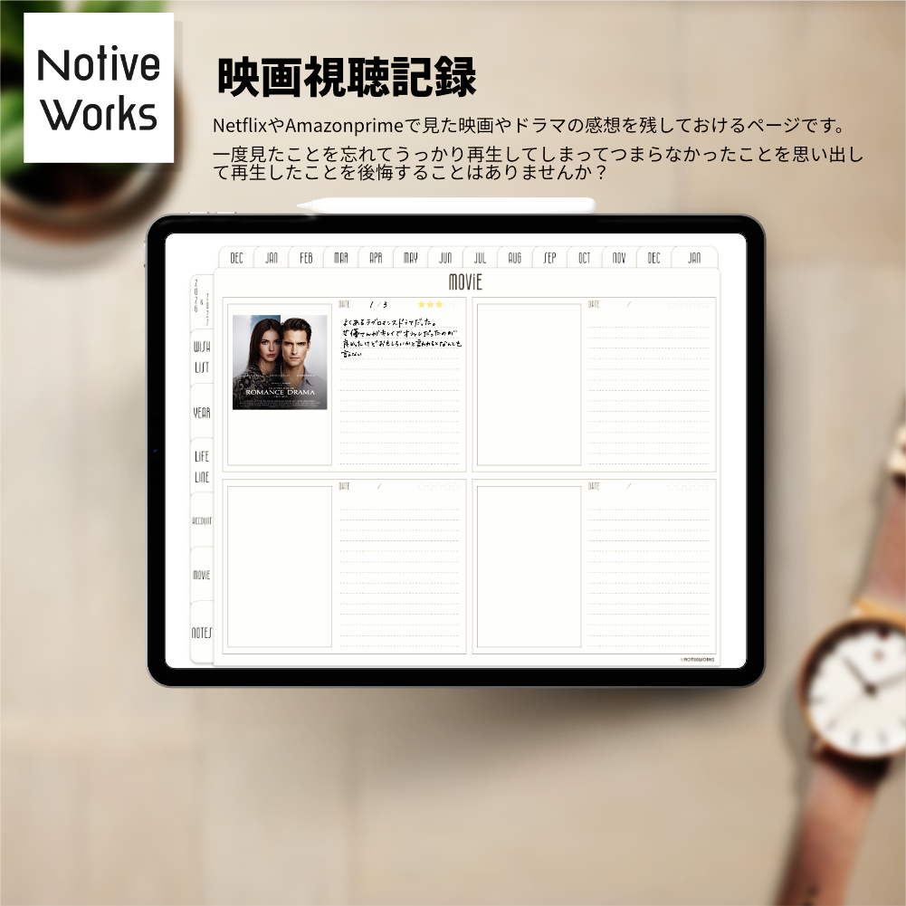学習も暮らしもひとつの器に。習慣トラッカー/家計簿/健康管理/1カ月の振り返りで継続と改善を支援し、アカウント管理/ライフライン連絡先でいざという時の情報も一元化。オフの充実には映画視聴記録も収録。やりたいこと100個を、計画と実行で確実に前へ——そんな“運用しやすさ”を追求しました。