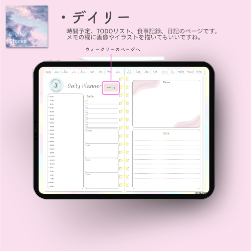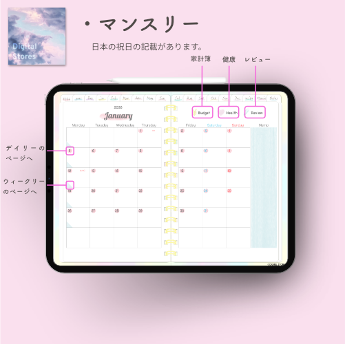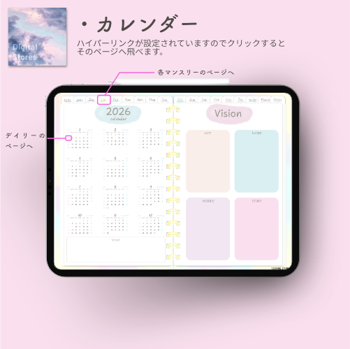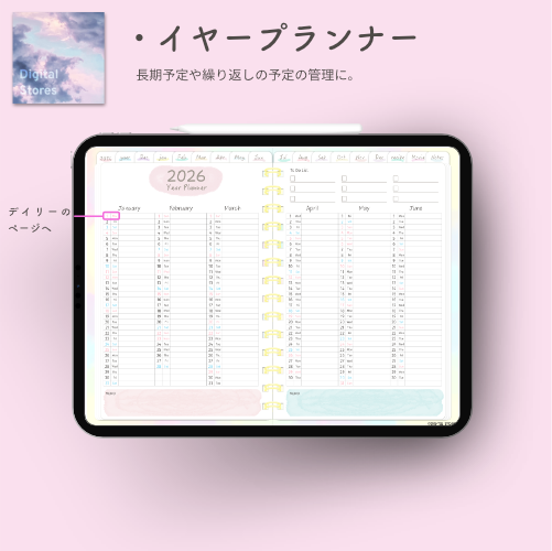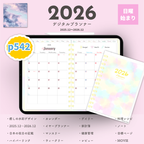 iPadのGoodnotesなどでご使用いただける2026年デジタルプランナーです。水彩絵の具風の優しい色合いで毎日穏やかにご機嫌で過ごせるようなおしゃれでかわいいデザインにしてみました。