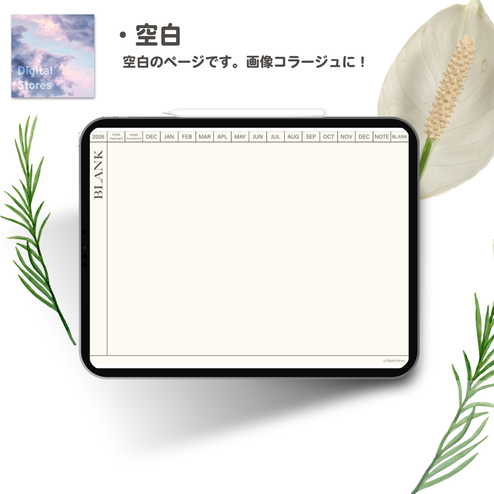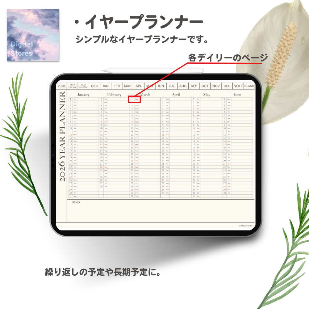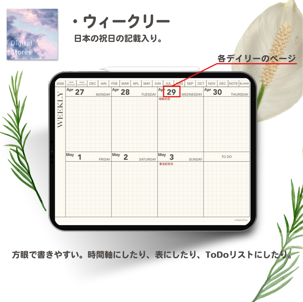 iPadのGoodnotesなどでご使用いただける2026年デジタルプランナーです。初めての方にも使用しやすいシンプル構成。無料版だとpdfデータサイズの5MBの読み込み制限のあるアプリでも読み込めます。2025年12月から2026年12月まで(PDFデータです。)各ページに飛べるようにリンクを設定してあります。日本の祝日の記載ありです。