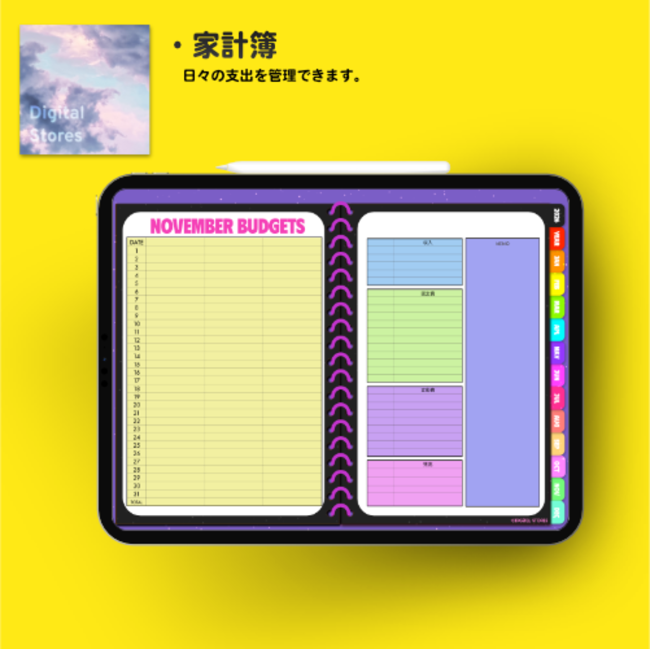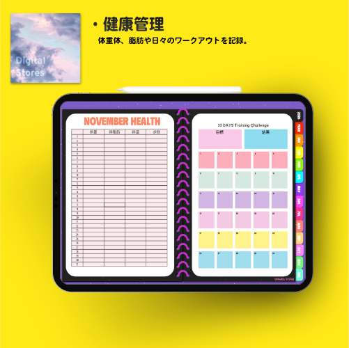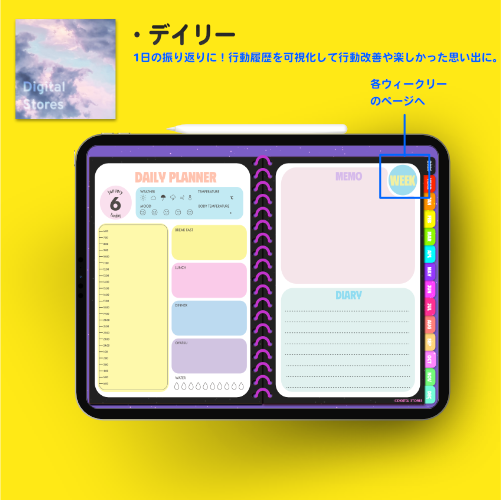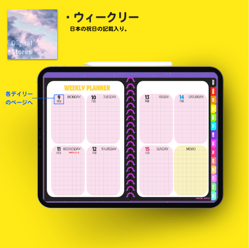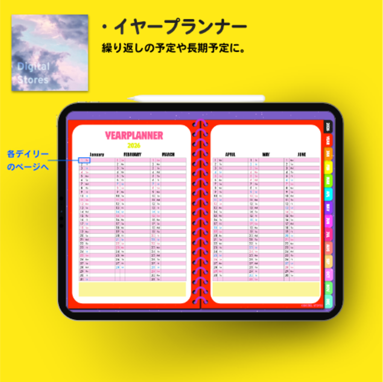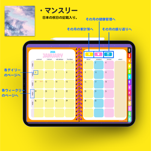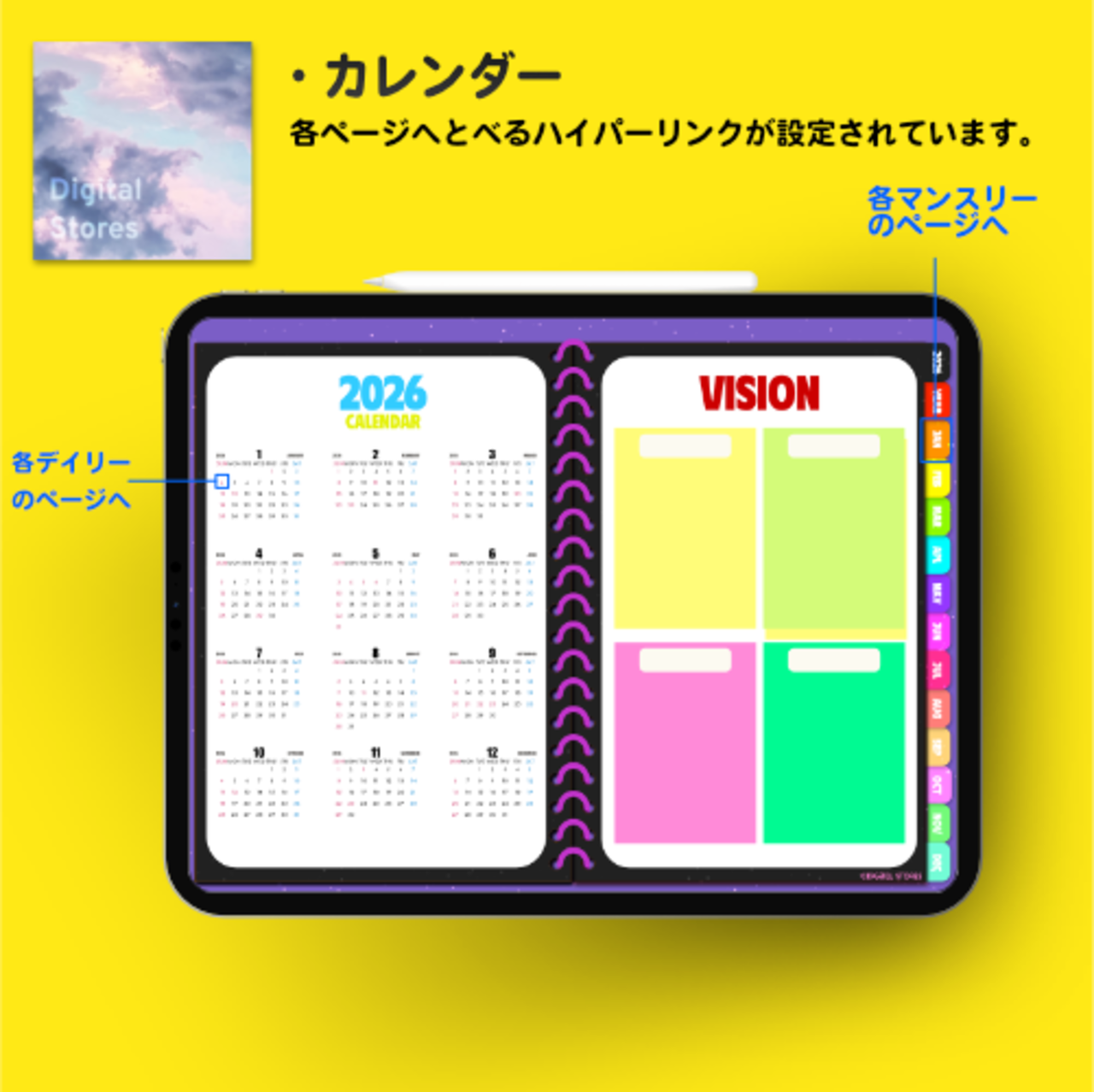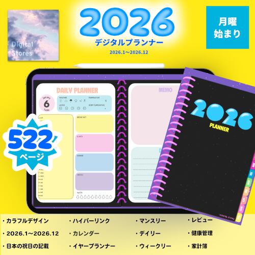 iPadのGoodnotesなどでご使用いただける2026年デジタルプランナーです。カラフルでかわいい♪元気デザイン。2025年12月から2026年12月まで(PDFデータです。)各ページに飛べるようにリンクを設定してあります。日本の祝日の記載ありです。