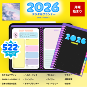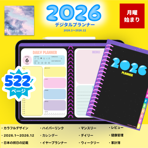iPadのGoodnotesなどでご使用いただける2026年デジタルプランナーです。カラフルでかわいい♪元気デザイン。2025年12月から2026年12月まで(PDFデータです。)各ページに飛べるようにリンクを設定してあります。日本の祝日の記載ありです。
