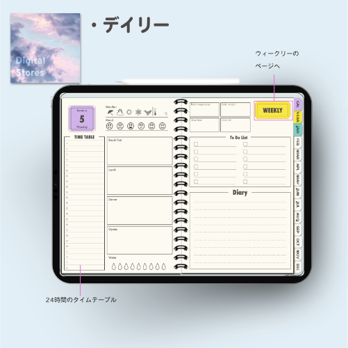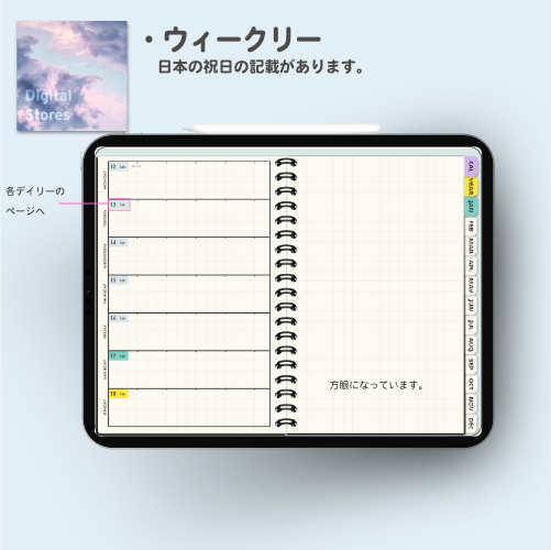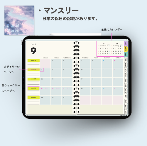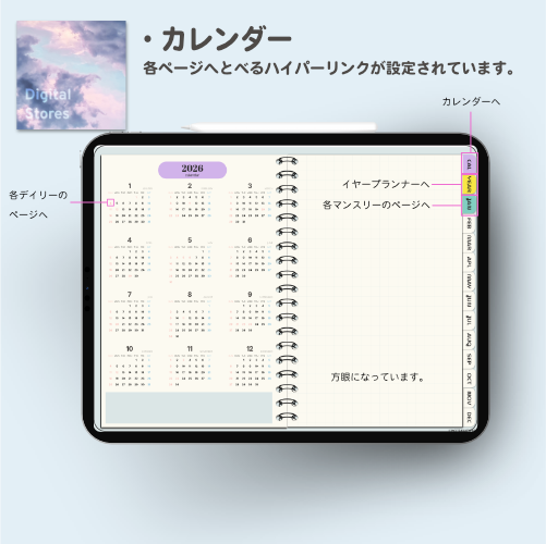 iPadのGoodnotesなどでご使用いただける2026年デジタルプランナーです。2026年1月から2026年12月まで(PDFデータです。)各ページに飛べるようにリンクを設定してあります。日本の祝日の記載ありです。