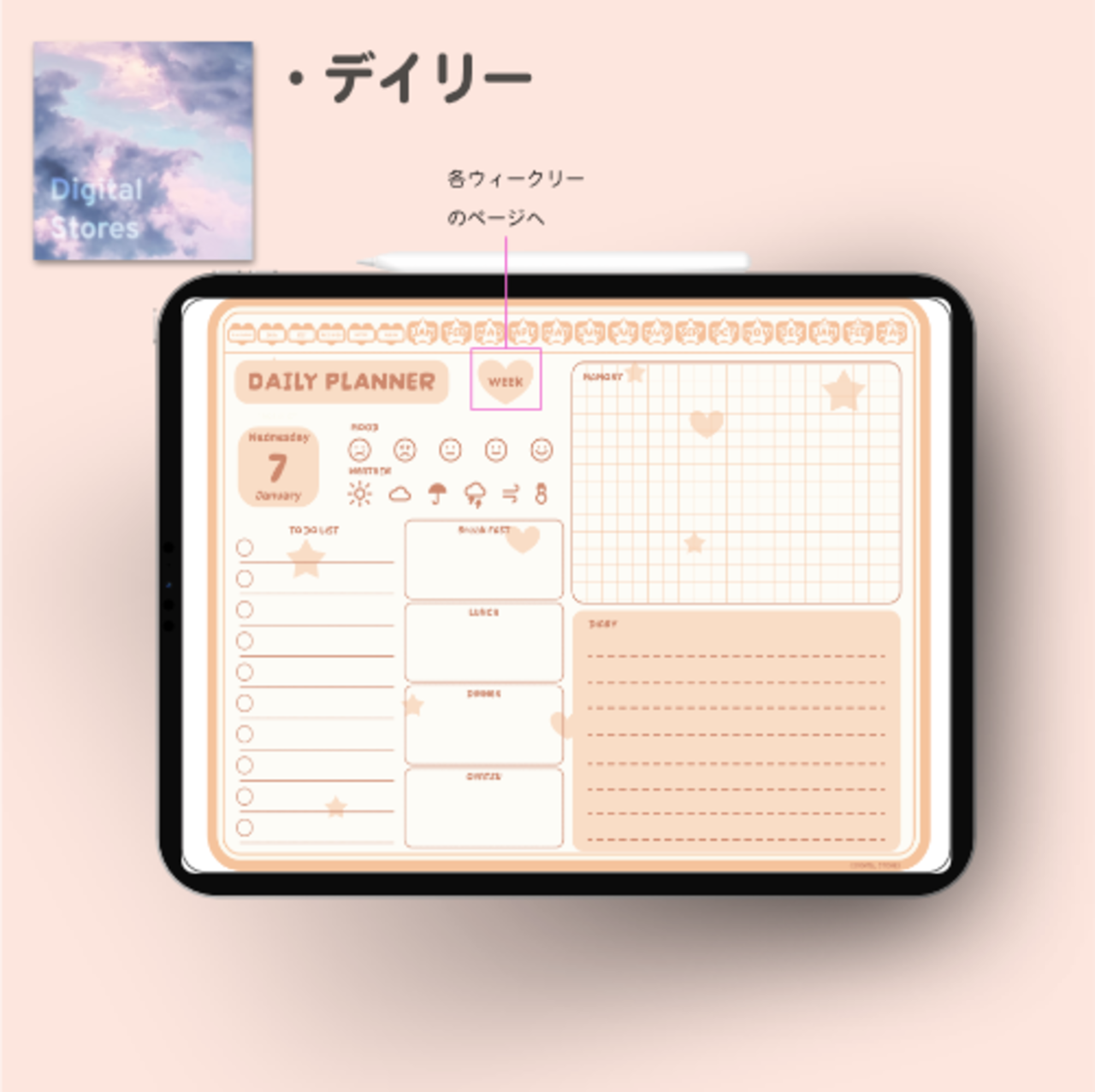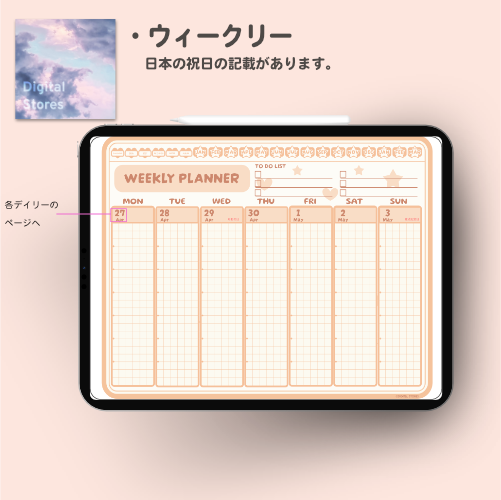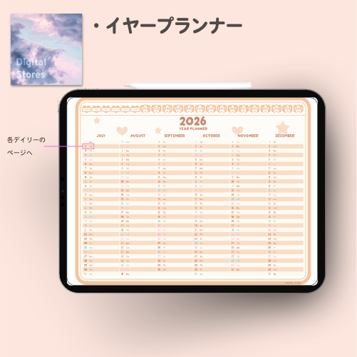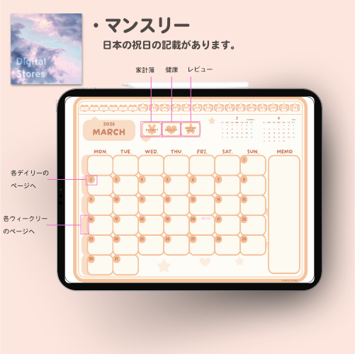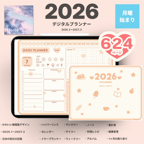iPadのGoodnotesなどでご使用いただける2026年デジタルプランナーです。かわいい韓国風デザイン。2026年1月から2027年3月まで(PDFデータです。)各ページに飛べるようにリンクを設定してあります。日本の祝日の記載ありです。