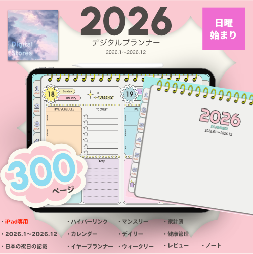 【2026年1月始まり】2026年デジタルプランナー|POPなデザイン!パステルカラーでかわいい!|マンスリー、ウィークリー、デイリー|日本の祝日の記載あり|iPad専用【日曜始まり】 | digitalstores