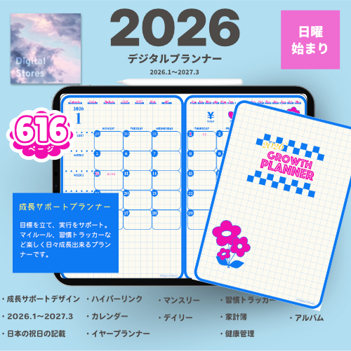 iPadのGoodnotesなどでご使用いただける2026年デジタルプランナーです。2026年は、もっと成長したいあなたへ。