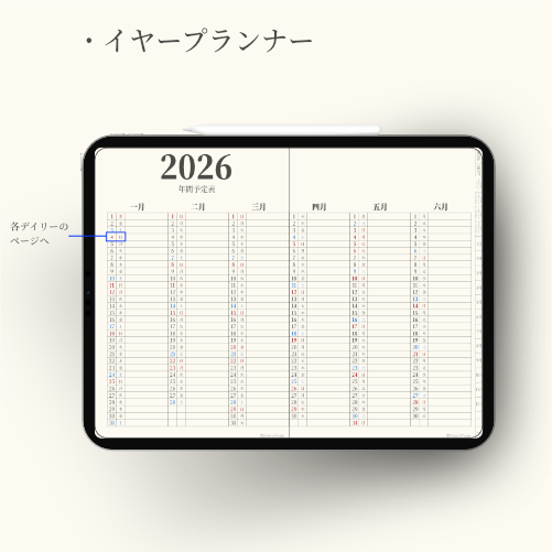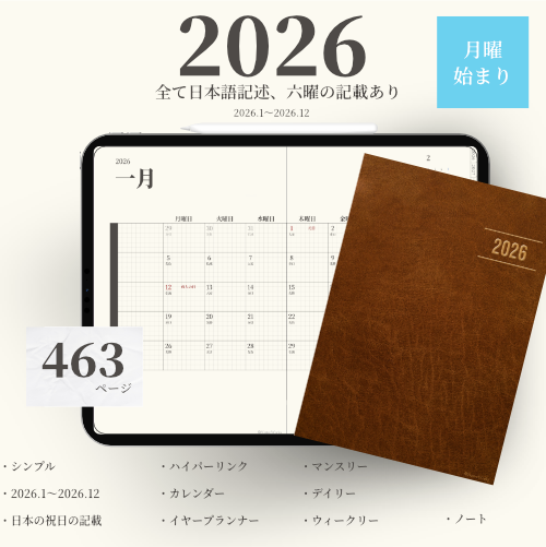 iPadのGoodnotesなどでご使用いただける、2026年1月始まりのデジタルプランナーです。